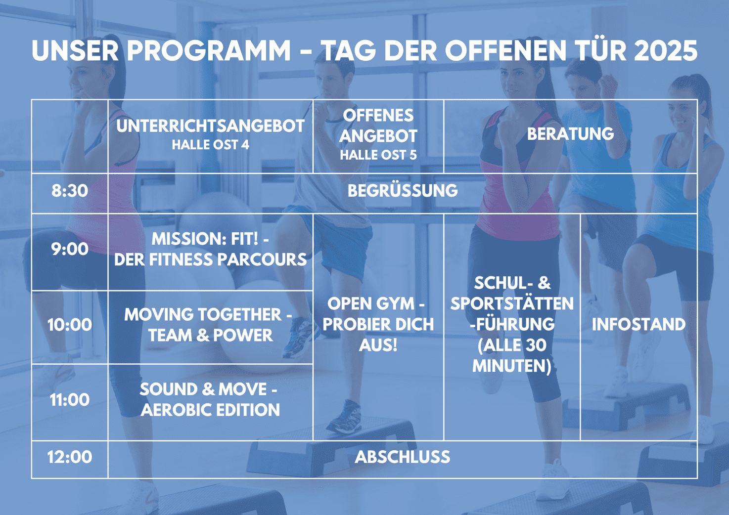 Zu Jahresende steht traditionell unser Tag der Offenen Tür an! Interessierte Schüler*innen können unsere Schule kennenlernen und sich in spannenden Workshops ein Bild von den Inhalten der Ausbildung zum*zur Gymnastiklehrer*in machen.