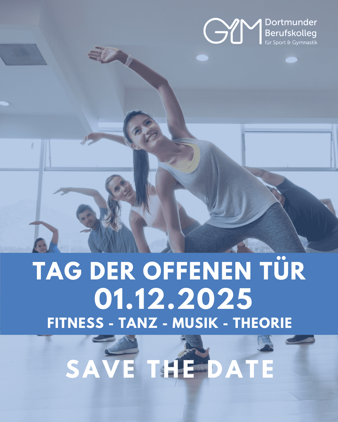 Du möchtest mehr über die abwechslungsreiche Ausbildung zum*zur Gymnastiklehrer*in erfahren? Dann informiere Dich an unseren Infotagen über die Theorie (z.B. Sportmedizin, Trainingslehre) und Praxis (u.a. Sporttherapie, Funktionelle Kreative Bewegungsbildung, Groupfitness) der Ausbildung und lasse Dich über die späteren Berufschancen beraten. Bei einem Hospitationstag kannst Du den Unterricht sogar hautnah kennenlernen.