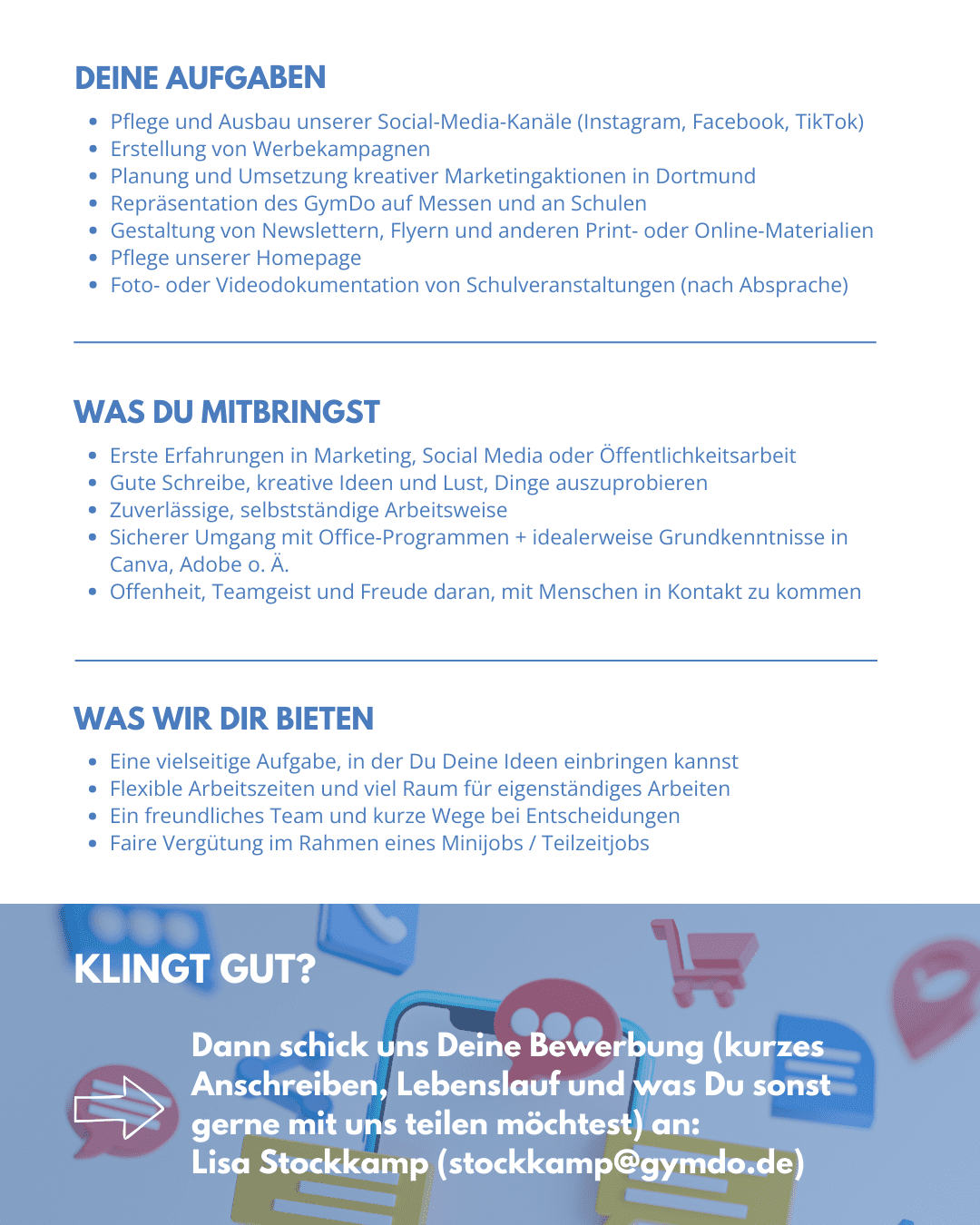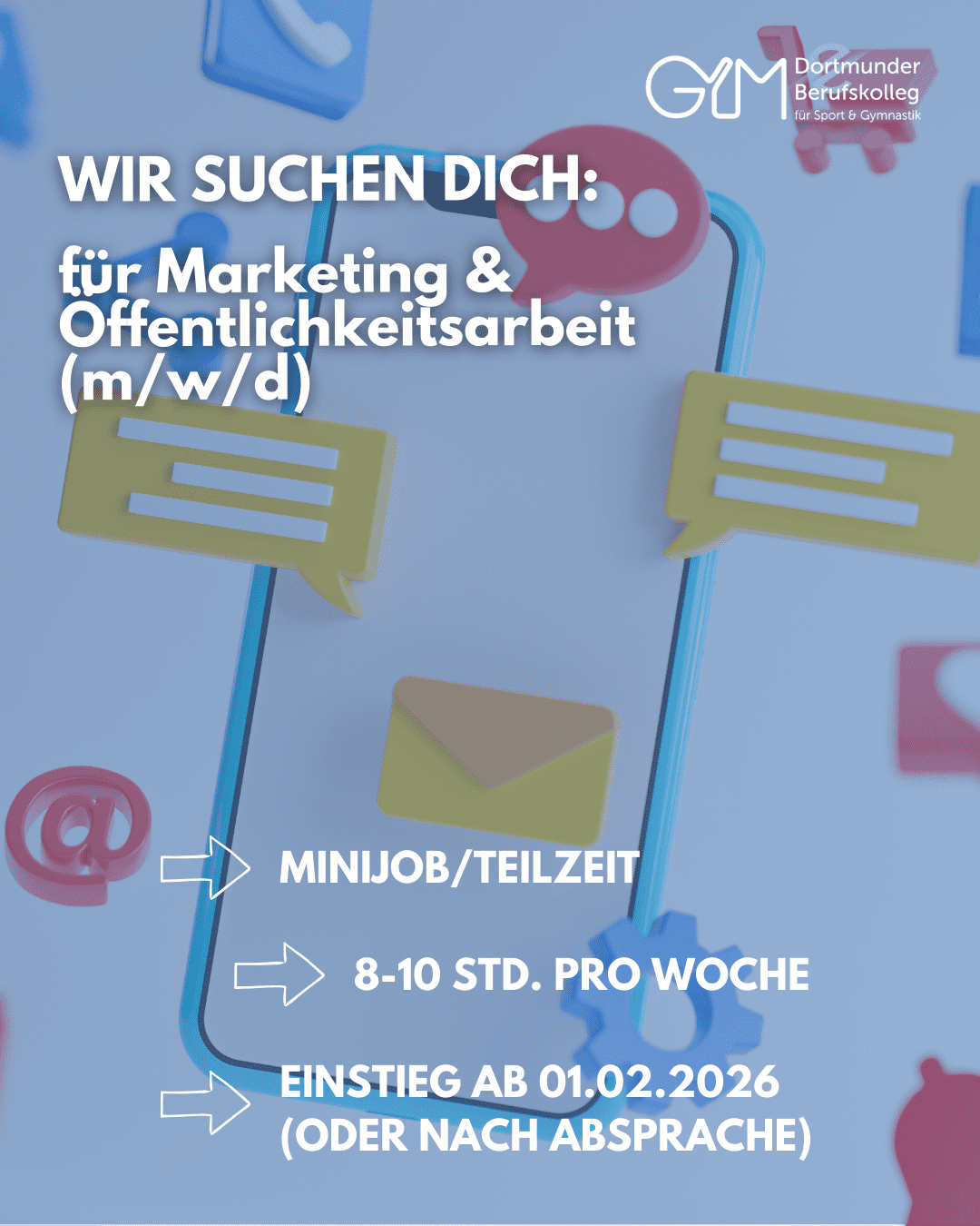 Du bist kreativ, kannst gute Texte schreiben, Bilder bearbeiten und bist fit im Umgang mit Social Media? Dann suchen wir DICH! Zur Verstärkung unseres Teams stellen wir ab dem 01.02.2026 eine*n Minijobber*in für Marketing & Öffentlichkeitsarbeit im Rahmen von 8-10 Stunden pro Woche ein. Du hast Interesse? Dann schick uns Deine Bewerbungsunterlagen an stockkamp@gymdo.de!
